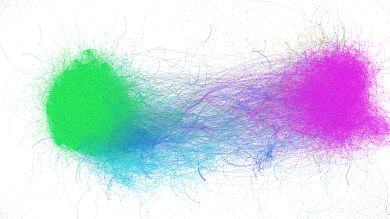 His analysis ends with the beautiful graph seen up top, created by connecting all the Twitter accounts engaged in "battle." He concludes thus: